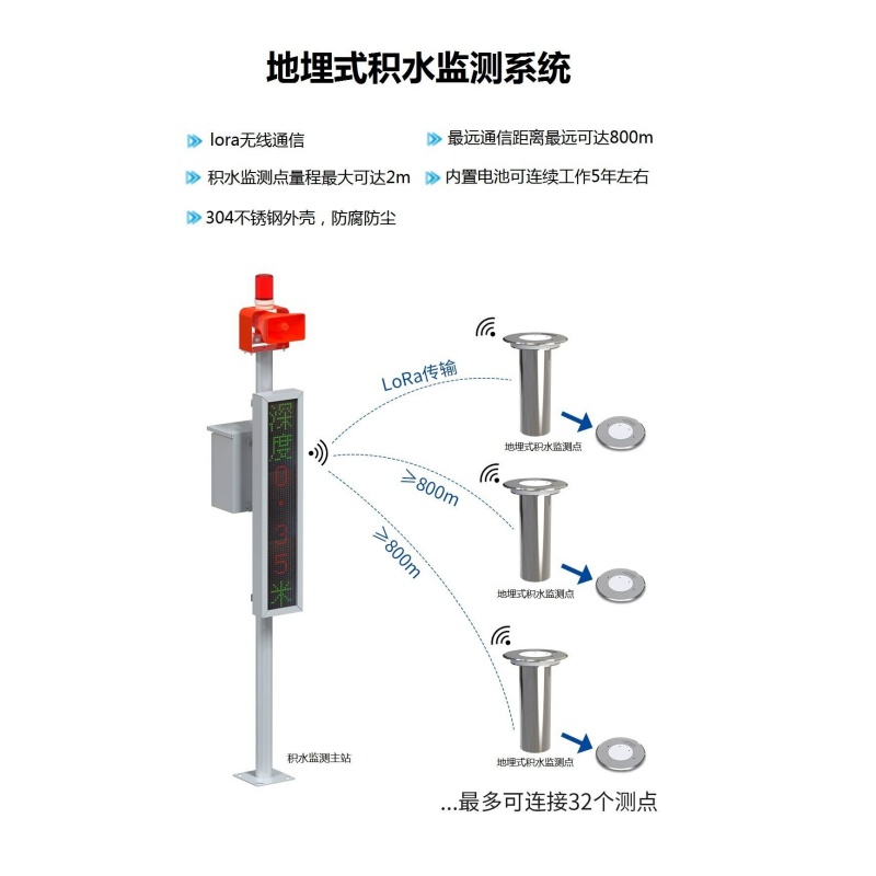 该款地埋式积水监测站采用全密封嵌入式结构,可完全埋于路面、人行道、地下车库入口等区域,不占用通行空间,不影响交通通行与城市美观,有效避免设备被车辆、行人碰撞损坏。设备搭载高精度水位传感器,可精准监测 0-100cm 积水深度,支持水位变化率实时监测,分钟级采集数据,可快速捕捉积水暴涨、退水等动态变化,提前预警内涝风险。